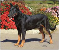 The beauceron, or "berger de Beauce" as originally known, is a working dog from France. Developed in the 1500s as a hunter of wild boar, they also became useful as a herding dog and guardian of the flock. The beauceron's history may include the Doberman pinscher. Contrary to what the original name implies, this French shepherd is not from Beauce but from Brie, sharing this origin with their cousin the briard. The name berger de Beauce was given to differentiate the two breeds. In 1911 the two breeds were noted as separate, and the Beauceron Club was formed.In addition to herding and working as a watchdog, the beauceron has a natural instinct to guard and protect. The breed is often used in police work, for protection and as a rescuer. The beauceron's reputation as an esteemed companion and protector is also recorded in portraits, which portray them as companions to kings.